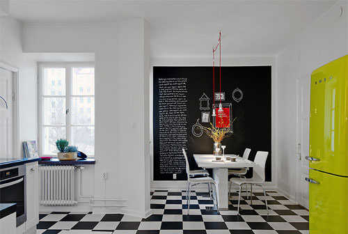 马赛克黑白色瓷砖地板带来强烈的视觉冲击。白色完美的中和了开放式餐厅大面积黑色背景墙,在白色的衬托下,显得更加气质不凡。明黄的冰箱为空间增添一抹亮色,整个厨房活泼了不少。