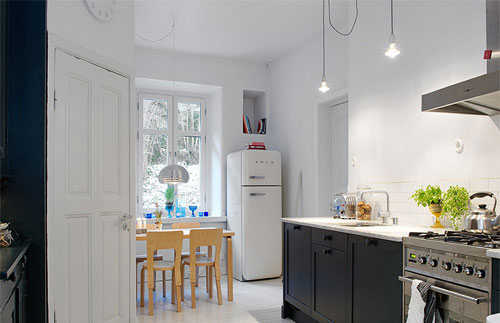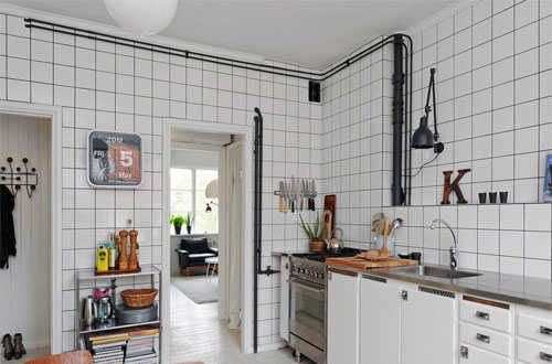 黑色台面搭配白色瓷砖墙体,让空间更加立体。几盏小灯为空间增添乐趣并且整体充满北欧风情。