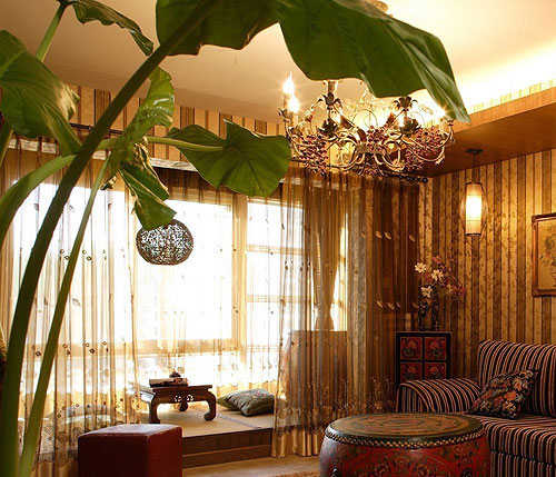 宽敞的飘窗台被改造成了一款古韵十足的榻榻米,窗户上的纱帘与旁边的布艺软隔断,皆采用了金色,配合上良好的自然采光,整个区域渲染出一种古色古香的中式氛围。值得一提的是,席面中间拼接处的包边十分精致,融入浓郁中式图纹,一扫原本的单调。