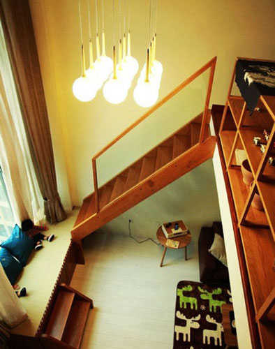 榻榻米不一定要十分宽敞,这款榻榻米设计就极具创意,?它直接连接着LOFT楼梯,独特的成为了二层到地楼的过渡区域,而席面与靠垫,让区域即可作过道又能驻足。