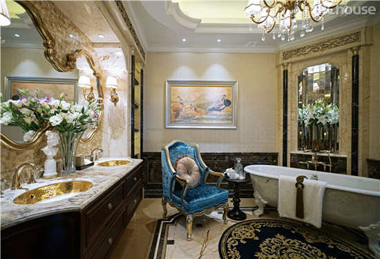 浴室的设计紧致、优雅。孔雀摆件姿态怡然,绚丽夺目。洗手台采用烟玉大理石,搭配古典贝壳马赛克的铺砌,定制的金色椭圆镜点缀,营造出一个浪漫、舒适的空间氛围,这不是一个传统意义上的浴室,而是可以品酒、身心愉悦的休憩所在。