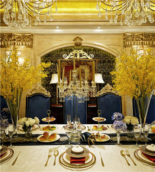 负一层大厅改设为宴会厅是具有仪式感的一个重要空间,宴会厅空间布局与陈设热烈、激情而又华丽,巴洛克激情艺术的气氛展露无遗,金色与蓝色的碰撞给人强烈的视觉震憾。