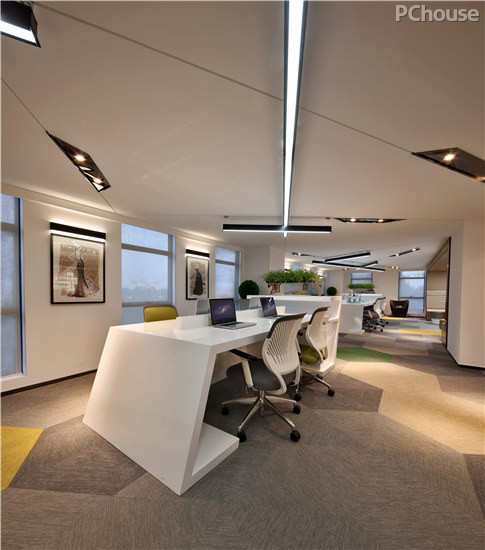 现代办公空间更多的着眼于体现工作与生活的有机融合、更加开放和趣味性。以区别与其它方正、正规中举的空间。因此,我们在设计的构思中引入了“折面与交叉线形”的手法,来打破对于空间传统的思维模式。