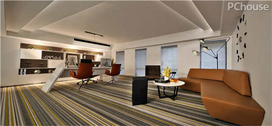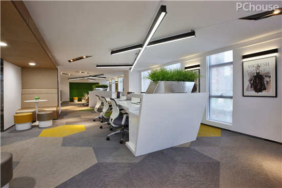 开放办公区在原有普通办公的功能上考虑了趣味办公和洽谈功能的体现,更多的半开放性和灵活性。对于一些局部空间的利用,如走道上空管道设备层和楼梯下方空间都设计成了橱窗、模特展示区,更能体现企业文化和形象展示。