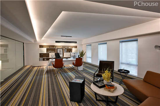 董事长办公室与空间的划分主要是通过玻璃隔断的形式来体现,不仅加强了采光性和展示性,还具有一定的隐私性。整个空间的色调中,主要是以黑白灰为主,局部通过黄色、绿色来点缀整个空间,为空间注入一份休闲的气氛。
