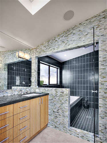 隔断也富有灵性,中间区域的隔断,用黑色马赛克瓷砖魅力包裹,中段部分是灯体,极为美观。它还用搁架与里侧隔断连接,制造出收纳区域,极具设计感。