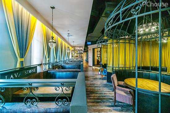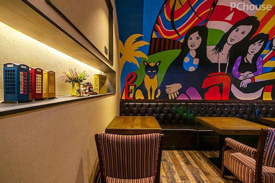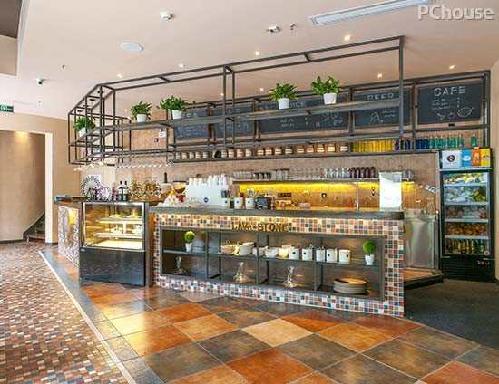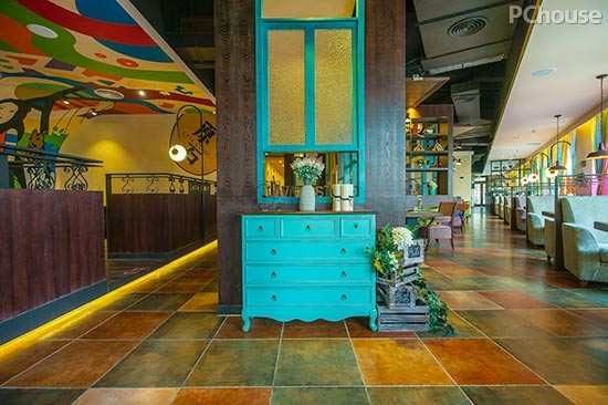 原石艺术餐厅,从空间整体上来看,这是一个色泽浓郁并丰富的世界,趣味波普的艺术墙面,仿古石墙和朴质地砖,亦或是鲜亮的彩色玻璃和复古优雅的家具,空间的每一面都生动多姿,让人惊喜。除了整体上的出彩,在细节上的考究和氛围上的营造,让整个空间更为饱满和丰富起来,吊顶上复古造型的灯具、休闲区怀旧风格的饰品,美式乡村风格的随性自然,掺和着干净利落的现代时尚。设计师将这种小细节和大块面巧妙的融合在一起,带给人意想不到的惊喜,营造了温馨愉快的就餐环境,同时也令人流连忘返乐在其中。