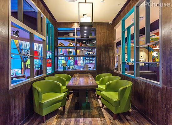 编辑点评:设计师在餐厅中部划分了一个小包间,它不同于传统的包间封闭隐秘,而是视野开拓的半开放式。坐在其中用餐,既能不受其他客人的干扰,又能与餐厅整体环境很好的互动,开阔的视线令整个空间更为宽敞,也增加了层次感。木地板、木饰面和木桌,仿佛是林中小屋,深沉厚重的棕色给人温暖的感觉。翠绿色的皮椅平滑且极富光泽感,点缀了木质特有的棕色,凝聚了“小屋”中的视觉焦点,和家人在此用餐让人倍感温馨。