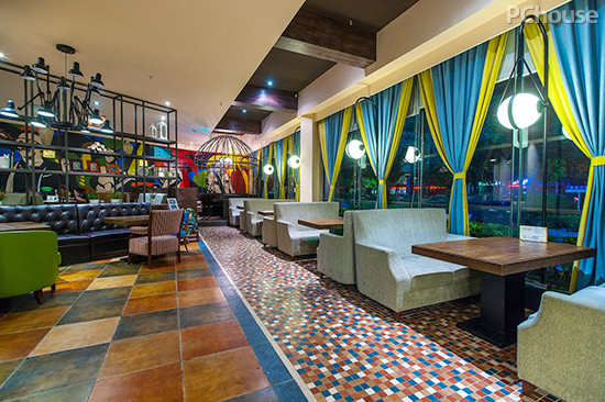 编辑点评:木质视线已被多彩的马赛克地砖所迷住,抬头便是黄蓝两色对比强烈的帘幔,裸露的木制吧椅上那一抹红,和谐了视线焦点,在这里品尝美食,和友人小声笑谈,望着窗外的夜景,让恬静和悠然定格在这一刻。