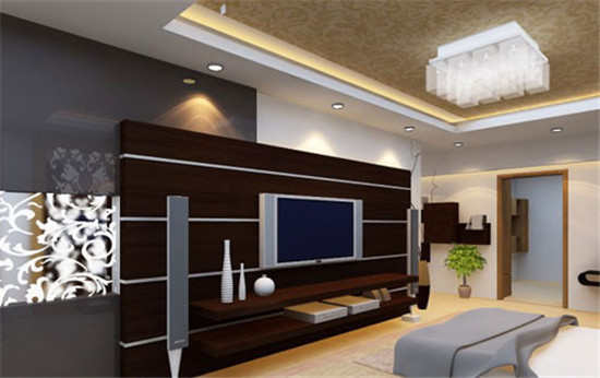 电视背景墙以深色木打造,为了凸显层次感,深色木上特地镶嵌了银色金属线,挂壁式的电视机当之无愧的成为深色木背景墙的主角,而下方特地添置的两排搁架,如隐形般的收纳起影碟机。