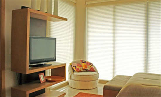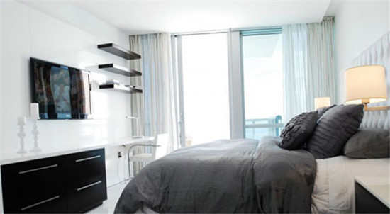小户型的卧室,也不忘设计一个享受快乐娱乐时光的电视区域,契合素雅的室内配色,电视背景墙设计采用了黑白色,黑色电视柜紧贴墙壁,有上角的三个平行搁板既是收纳区又是种装饰。