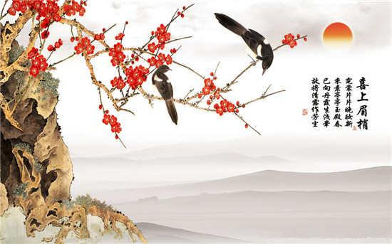 小编的话:喜上眉梢是汉族传统吉祥纹样之一,喜鹊在中国文化中寓意吉祥。喜鹊立于梅花之上,连在一起,既是喜上眉梢,两只喜鹊有着双喜临门之意。