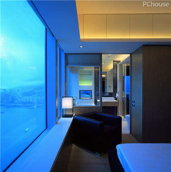 开放式主卫装上了大面积玻璃,可与室内的人形成互动,增加情调;另一方面,浴缸的选择和位置在节省空间、光照处理方面也颇具心思。
