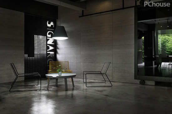 编辑点评:仔细观察,你会发现大厅的桌子是一个三角结构,大跨距的钢构桌脚,结合石英墙饰板材,恰与空间的铁板、构架如出一辙而融为一体。
