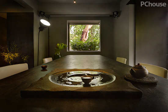 编辑点评:首先映入眼帘的并不是桌椅摆设,而是冷峻空间里捎来的这一株绿,如果你以为这抹绿仅仅是为了柔化空间,那你就大错特错了,设计师将其放置于此的目的,是因为它形似一个现代雕塑品,而天然的雕塑品与窗外的绿树恰好遥相呼应,再次体现了隐于山林之间的设计理念。