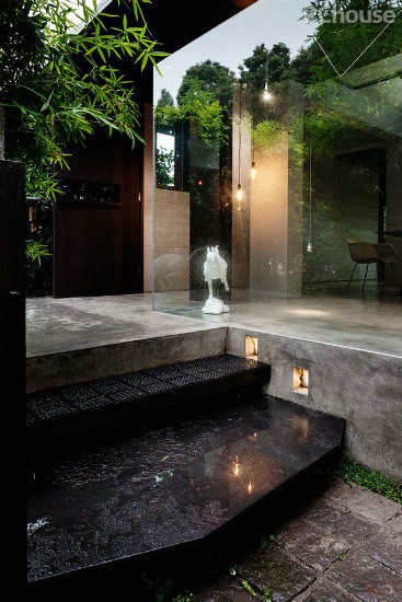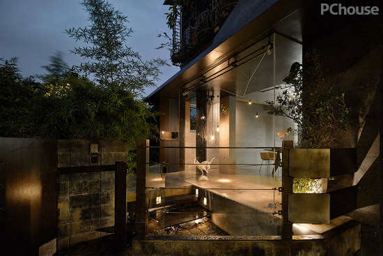 编辑点评:换一个角度,从建筑里面看入口处,厚厚的铁板实为脚踏阶,登上大门的前庭,水泥、岛台内外浑然一体,设计师还细心地采用了防震橡胶包裹铁板,使得入口处整体颜色既相得益彰,又具实用性,形似奔跑的艺术品更是为入口处增添了一种活力。