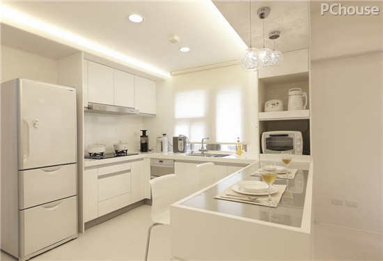 编者点评:ㄇ字型的动线规划提高了厨房以及餐厅的空间利用率,也让大型电器冰箱有着可放置之处。