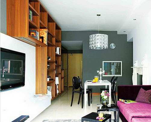 潮流时尚家装 客厅设计案例效果图:如果客厅的面积非常局促,甚至无法满足一个沙发边柜的摆放需求,那么将搁架设计在沙发边上,随手可得。