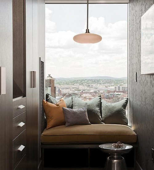 说是畸零空间,有点奢侈,设计师特意为之的窄小空间,为的是满足女主人既私密又开放的设计需求,墙壁上打造了固定的柜体衣帽间,还不过,熠熠生辉的材质没啥刺可挑。