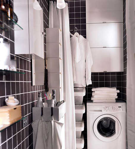 浴室采用了最最小巧款的洗脸池柜,正对着入口。挂钩等一些人性化的添置,使得整个洗脸池区域便捷而有序。卫浴间右侧是洗衣区域,小巧的洗衣机靠角落而放,除了洗衣机上方的壁柜,一旁的白色塑料储物盒也同时用作收纳。洗衣区外侧还贴心地用布帘做隔断,不用时就将布帘拉起,保持空间整洁感。