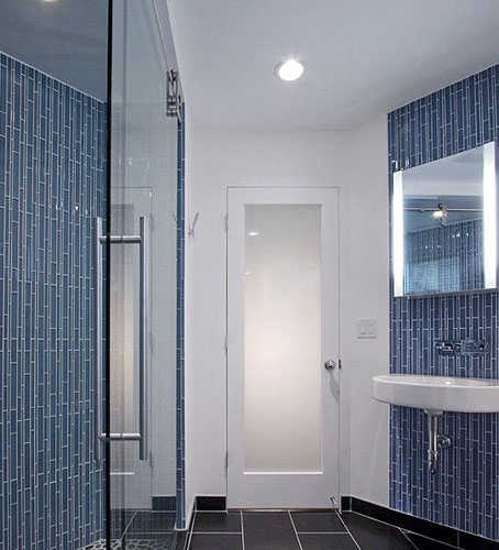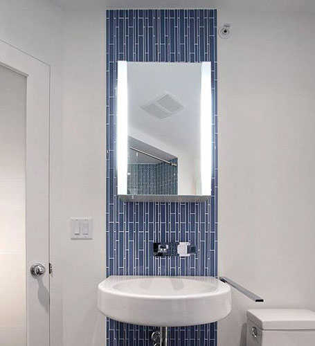 左侧则是洗面台,挂壁式的设计配合上蓝色瓷砖背景,让区域十分清爽。采用镜柜,让镜子与收纳二合一。