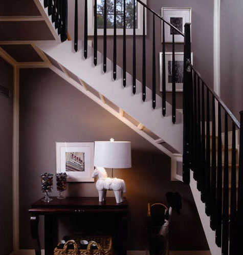 小编点评:转了弯的楼梯在下方的空间上也会受到影响,低矮的地方不太适合当做书房或者休息区使用了,所以设计成展览区域也挺好。小方桌上安置的是主人喜爱的小饰品以及照明用的台灯。