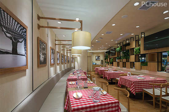 编辑点评:餐厅台面沿用了西贝红格子台布,具有强烈的辨识度,将品牌形象突出的淋漓尽致。