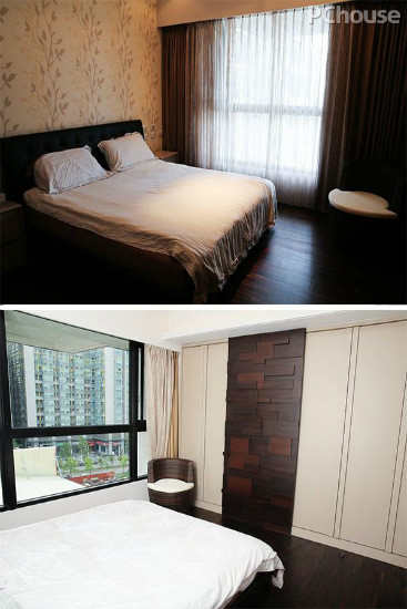 小编点评:以花草藤蔓的壁纸装饰,床尾则是铁刀实木皮及跳色烤漆,沉稳却又不减婚房的温馨氛围。