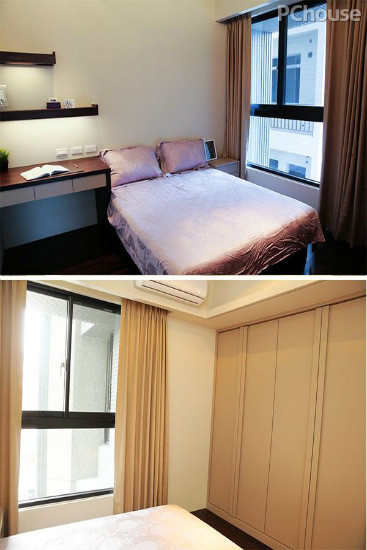 小编点评:次卧的设计中,开放式的书架,使墙面有清爽简洁的视感,而床尾成排的衣橱,又能够满足大量的收纳需求。