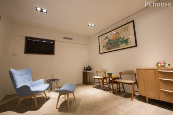 小编点评:形式开放的厅区与书房设定,藉由地材色泽深浅明确界定机能划分。