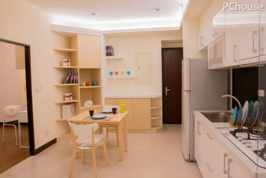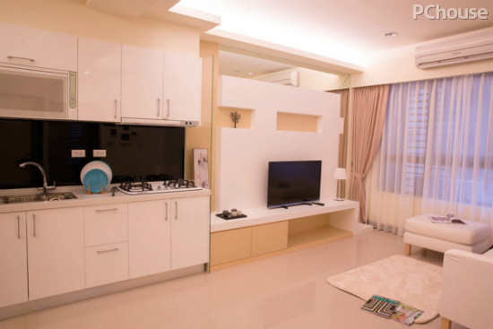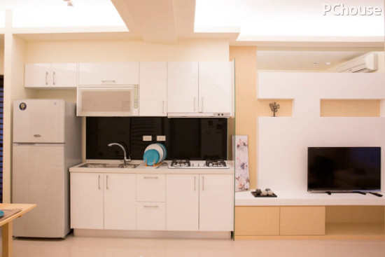 小编点评:冰箱、橱柜、水池、灶头样样齐全,机能全备的小厨房,满足主人最基本的开伙需求,厨具与电视墙间以玻璃挡去逸散的油烟。