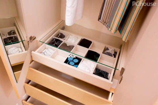 小编点评:衣物收纳不需要的长度,留给收纳贴身衣物及小配件的暗抽;加上最上方的方格,可收纳区竟多达六层,强大的收纳机能让小空间也能“海纳百川”。