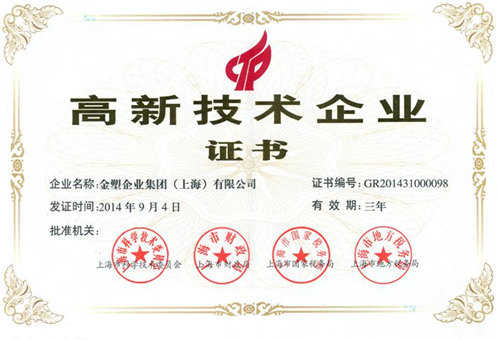 2014年9月,根据《高新技术企业认定管理方法》和《高新技术企业认定管理工作指导》的相关规定,我公司被认定国家级高新技术企业,并于近日收到上海市科学技术委员会、上海市财政局、上海市国家税务局、上海市地方税务局联合颁发的《高新技术企业证书》(编码GR201431000098)。