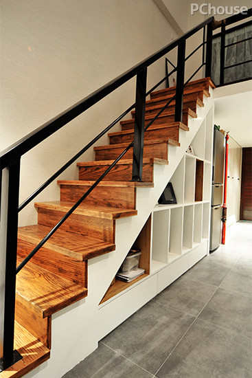 编辑点评:楼梯设计精妙绝伦,木制阶梯拾级而上,黑色扶手产生浓浓独特的LOFT韵味。楼梯底部的多宝阁和抽屉有很强的收纳功能。凌乱的物品在此处服服帖帖,不露声色。