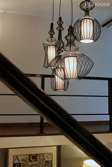 编辑点评:吊顶上的灯饰也同样引人注目,似灯笼、又似造型不一的香水瓶。圆柱灯芯在金属银线条的包裹下,显得精美和别致。高低不一的视觉矛盾体一字罗列,产生了令人好奇的效果。