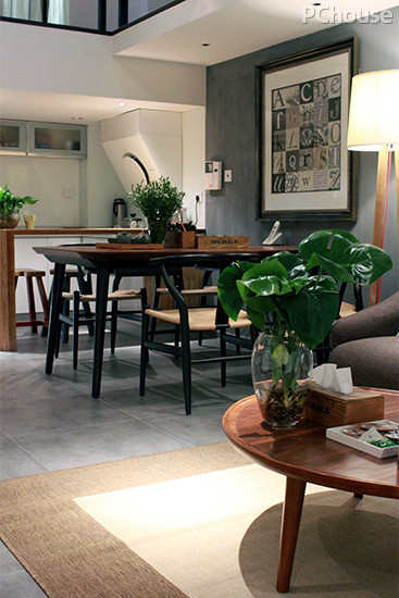 编辑点评:一层空间主要以客餐厅和厨卫为主。客厅空间内敛、质朴,传统与现代风格相互融合,设计师以现代的装饰手法和家具,结合古典中式的元素,呈现了一种亦古亦今的空间氛围。水泥灰色的壁纸、地砖,让客厅更有视觉深度,低矮的圆几巧妙地解决了层高较低的缺陷。