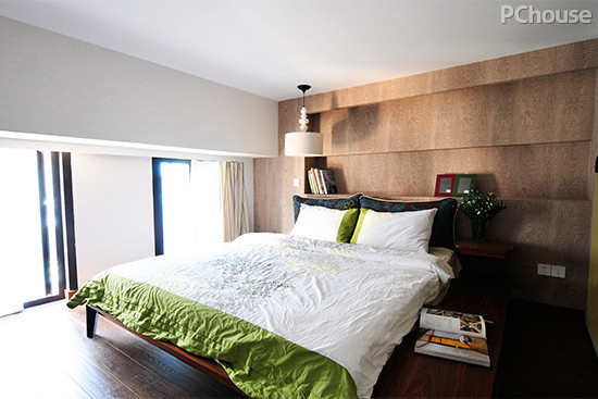 编辑点评:二层以卧室为主。整个空间根据房型而搭配。低矮的床榻迎合了层高不高的需求,床头墙面的流畅的沟槽处理可以放置书籍、相片等暖心的物件。木纹纹理的壁纸,令生活品质更具质感。腾空设计的床头边几有效地利用了空间,一株绿植又抹上了一丝自然的味道。