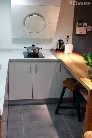 编辑点评:开放式厨房,却没有因为空间的限制而懈怠。设计师别具匠心,将原木色的搭台设计成一个简易的吧台,与客餐厅进行了隔断。L形的白色厨柜,灰色的台面,纯白色待机状态的油烟机也成了装饰品。