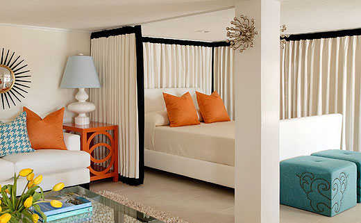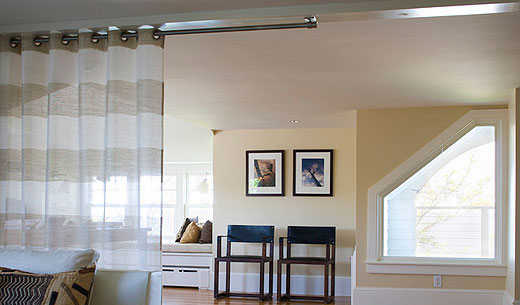 如何让较大的空间丰富多姿而不空荡荡?隔断也许是不错的选择,而软隔断则是价格便宜、最易打造的最佳之选。紧贴客厅的沙发区域,顶部设立挂杆,悬挂半透的沙质挂帘,将大客厅巧妙隔断,并进一步给予了沙发区更多私密感。