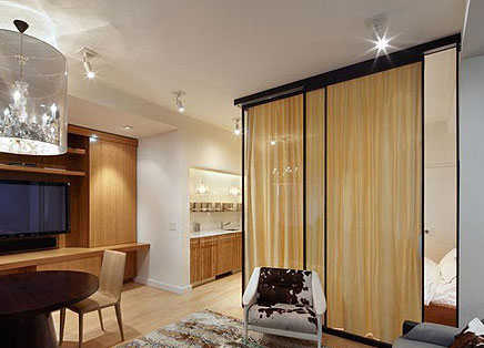 又是十分精彩的一居室设计,卧室的不仅采用了保证居室通透的玻璃隔断,且是可以移动的灵活设计,最绝妙的是它同时又结合了贴心软隔断,随时进行透明与不透明之间的转换。