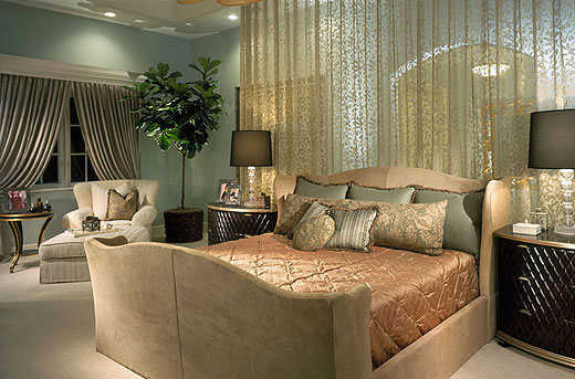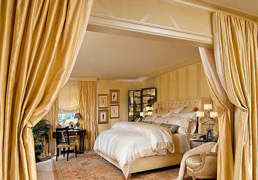 华丽的金色卧室,在极为宽敞的空间中施展皇室风韵。卧室不仅仅是卧室,特地设计的小客厅,让家多了一个宁静的会客区,并用金色布帘将其与卧床区域优雅分割,而双层的布帘设计,让隔断效果更为佳。