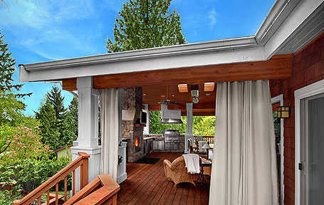 宽敞的阳台空间,被打造成了介于室内与室外之间的魅力区域,客厅、餐厅、厨房,都可以在这儿觅得,没有窗体,仍由微风吹入,但进口处的隔断处理,却十分必要,为了不让其太生硬,布艺软隔断仿佛是最佳之选。