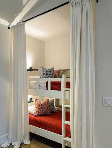 极小的空间内,也能让孩子拥有较为私密的个人空间,贴心的软隔断,不仅将卧床与外界隔开,更是让上下床进一步隔绝,小小区域温馨而美好。