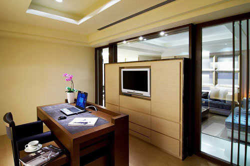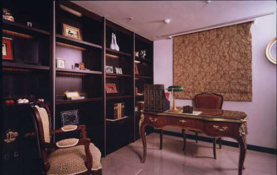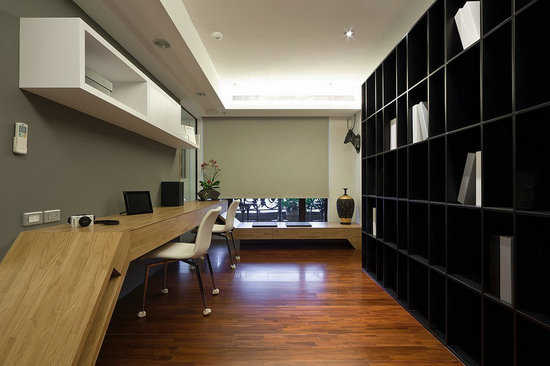 编辑点评:书房以黑檀木做开放式书柜的质材安排,沉稳俐落之间,具展示效果。