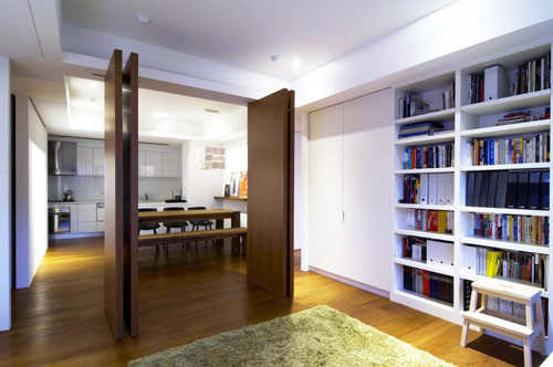 编辑点评:运用双面柜的使用机能创意,书房与客厅共同使用主墙成为TV部分,同时简单的造型安排将收纳机能隐匿其中,以清玻璃搭配线条衍伸出对称语汇,成为彼此间的区域分界,通透及利落感兼备。