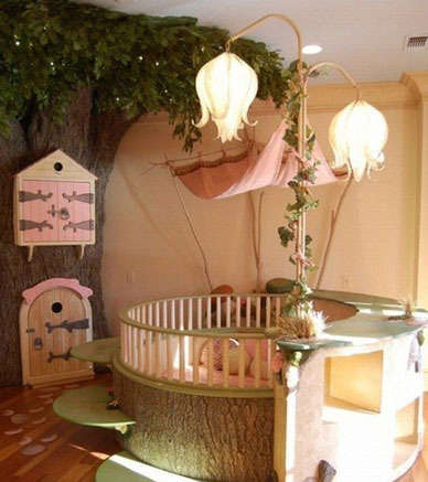 一棵原始大树、圆形的婴儿床、花朵图案的灯罩,使整个房间都弥漫着丛林的气息。大树上还装上了小门,更是使之充满神秘色彩,在这里面是不是住着小精灵呢。