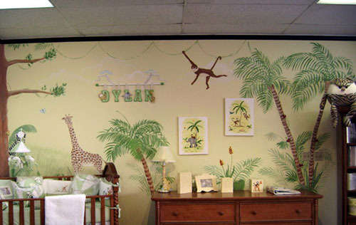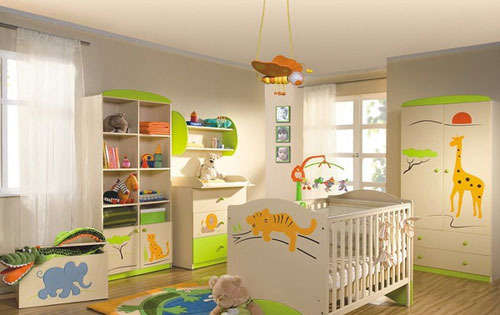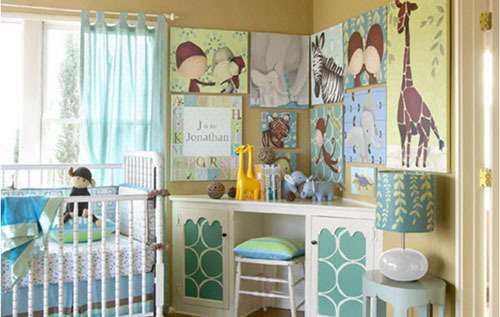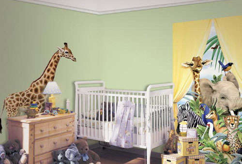 原木质地的小柜子,可爱的长颈鹿,使这个婴儿房弥漫着热带雨林的气息。你们瞧,绿色的墙面上正拉开帷幕,小动物们都在往这看呢。