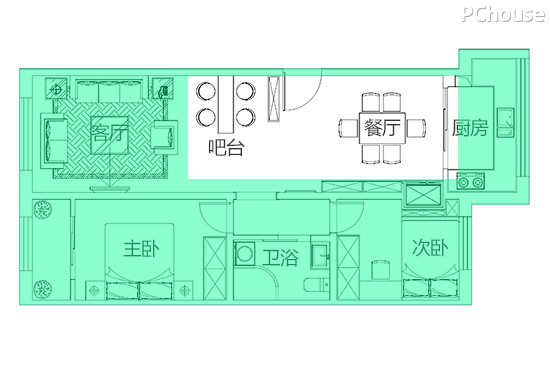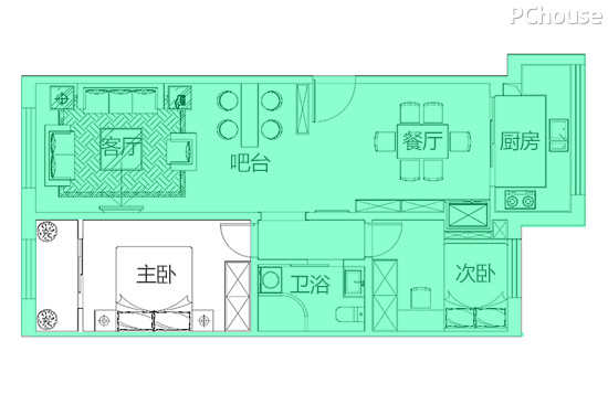1. 户型整体狭长,只有前后两边有采光,吧台、餐厅处光线较暗。