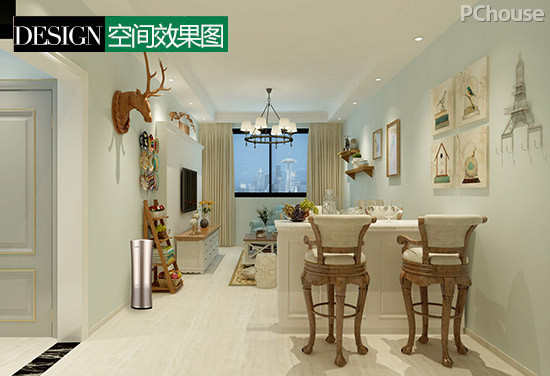 1. 客厅格局整体较长,在靠近大门的高柜背面设置一个休闲的吧台。