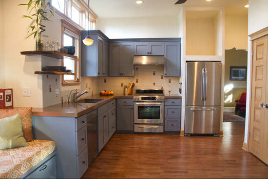 该厨房是典型的L型开放式空间,因省去了吧台而显得特别开阔和干净整洁。利用墙体间隔打造出两个独立的内嵌收纳空间,提升了厨房的收纳能力。